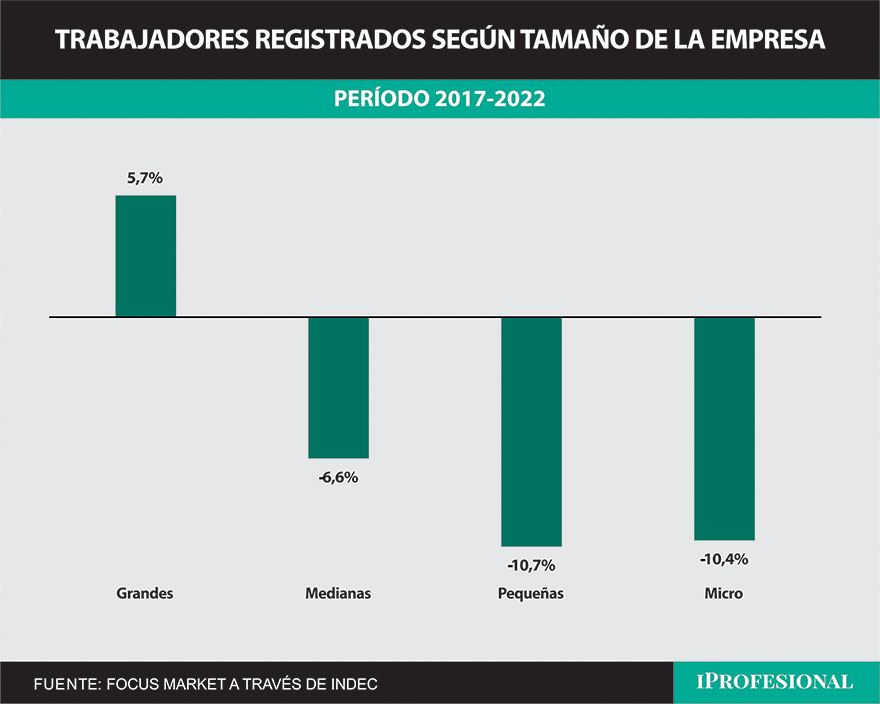 En cuanto a los trabajadores registrados del sector privado según tamaño, del 2017 al 2022, se observó que las microempresas o pequeñas empresas tuvieron caída en su personal entre un 2,0% y 4,3%. Por su lado, las grandes o medianas empresas incrementaron su dotación de personal, pero a niveles menores al 5% en 6 años.