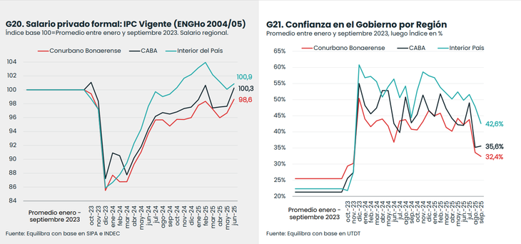 A su vez, Equilibra subraya que la pérdida de ingresos fue mayor en el conurbano bonaerense que en el interior del país, lo que generó una fuerte pérdida del caudal de votos en PBA durante septiembre y se espera que continúe durante estos comicios. Ese territorio es, de hecho, donde el Gobierno espera un resultado más adverso.