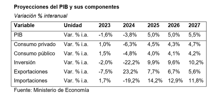 En cuanto a los componentes del PBI, el escenario oficial prevé que el consumo privado crezca 4,5% (tras caer 6,3% en 2024); el consumo público, 4% (luego de bajar 4,8%); la inversión rebotaría 9,9% después de hundirse 22,2% este año; las exportaciones subirían 7,7% en cantidades y 9% medido en divisas; y las importaciones repuntarían 14,2%.