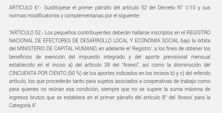 Para entender esto hay que recordar que el gobierno pretendía eliminar esta categoría de contribuyentes, que no pagaba el componente fiscal, pero que el Congreso insistió en mantenerla aunque con un aporte inferior respecto del monotributo común.