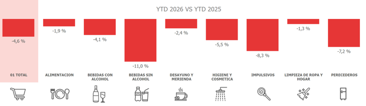 Entre los canales más afectados se encuentran los supermercados, donde el consumo se desplomó 5,9% frente a febrero de 2025 y un 6,3% en comparación con enero; mientras que el que tuvo un mejor desempeño fue el e-commerce con un avance anual del 26,5%, aunque con una baja del 2,6% mensual.