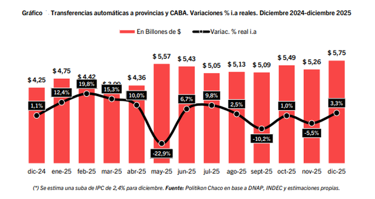 Según indicó Politikon Chaco, las Transferencias automáticas crecieron en diciembre 3,3% interanual real en diciembre mientras que el total 2025 cerró en 1,7%, con una débil coparticipación que fue “salvada” por los recursos de compensación del Consenso Fiscal. Para el cálculo, la consultora que tomó una inflación estimada en diciembre del 2,4%.